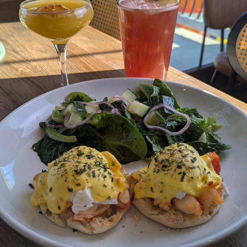 Poached egg | pork belly | hollandaise | toasted English muffin | side of house | salad