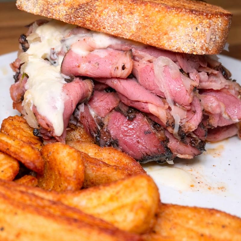 Carnegie deli pastrami | chunky russian dressing | kraut | raclette fondue | seeded marble rye