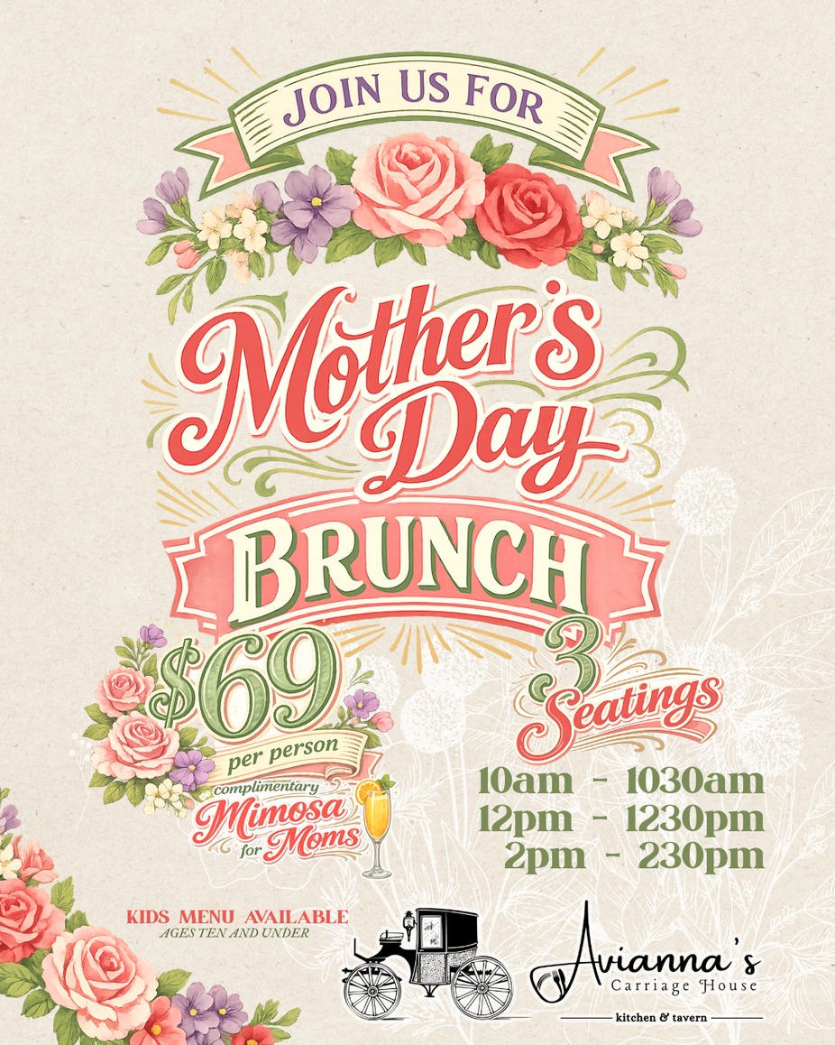 Make this Mother’s Day one to remember at Avianna’s Carriage House. Join us for a beautifully curated brunch featuring favorites like burrata & jam, deviled eggs with bacon jam, crab cake benedict, caramelized crepes, and our signature short rib hash. Every mom will be welcomed with a complimentary mimosa, because she deserves nothing less. 🥂 We’ll be offering three seatings, so gather the family, dress up a little, and let us take care of the rest. Reservations are limited — secure your table today.